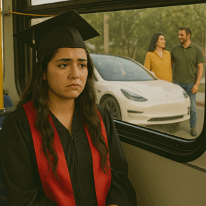 “Mis padres me hicieron ir en camión a mi graduación, mientras le compraban un Tesla a mi hermano menor. En ese momento sentí que mi propio valor no existía para ellos… pero lo que descubrí después, y cómo decidí responder, dejó a toda mi familia completamente en shock.”