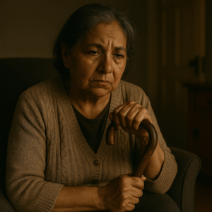 Esa noche, cuando el silencio llenaba la casa, Elena no lograba dormir. Caminaba por el pasillo con el bastón de su difunto esposo en la mano, un objeto que le daba una fuerza simbólica.