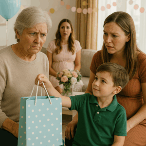 Lo que debía ser una celebración terminó siendo un juicio público. Eleanor intentó humillar, pero fue un niño quien puso a todos en su lugar con cinco palabras y un regalo cargado de amor.