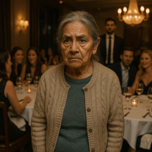 Entonces, a las siete en punto, una anciana entró sola. Su cardigan mostraba hilos sueltos en las mangas, sus zapatos eran ortopédicos y su caminar lento contrastaba con la arrogancia de quienes llenaban el salón.