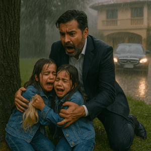 El millonario salió corriendo sin apagar el motor, resbalando en la hierba mojada. Emma y Sofía corrieron hacia él, gritando “¡papá!” con desesperación.