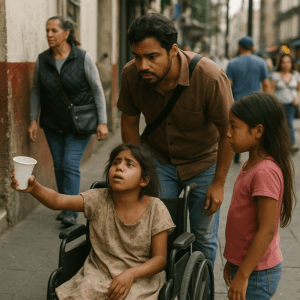 Frente a su tienda, en la esquina donde los gatos solían pelear por las sobras, vio a una niña sentada en una silla de ruedas improvisada, hecha con piezas viejas y cuerdas. Sus ojos grandes y oscuros lo miraban con una mezcla de hambre y vergüenza. Tenía el cabello enredado, las manos pequeñas, el rostro pálido y una manta delgada cubriéndole las piernas.