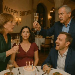 Cumplía treinta años, pero lo que debía ser celebración se convirtió en humillación cuando su suegra brindó para ridiculizarla frente a la élite y su propio esposo rió sin piedad. Lo que nadie esperaba era la respuesta de su padre: un gesto devastador que dejó a la familia rica en shock.