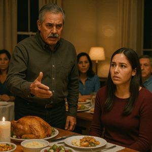 Esa noche de Acción de Gracias comenzó como cualquier otra en nuestra familia: el aroma del pavo recién horneado, las risas fingidas alrededor de la mesa y ese silencio tenso que todos intentábamos cubrir con brindis forzados. Pero en el fondo, todos sabíamos que algo estaba a punto de pasar. Mi padre —un hombre de pocas palabras y muchos secretos— tenía esa mirada fría que solo mostraba cuando estaba a punto de soltar una bomba.