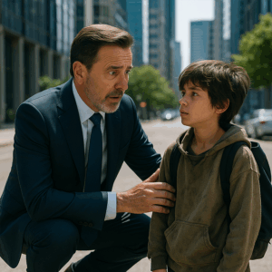 El sol del mediodía se reflejaba en las torres de cristal de la ciudad cuando Ethan Ward, uno de los hombres más ricos y respetados, salió de una reunión rutinaria. Sus pasos eran firmes, acostumbrados al poder, hasta que algo lo detuvo en seco: un niño sentado en la acera, con la mirada perdida y la ropa hecha jirones.