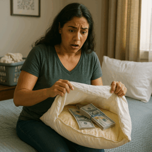 Entre el relleno de plumas y espuma, Emma extrajo un sobre de papel grueso. Al abrirlo, sus ojos se agrandaron: fajos de billetes bien doblados, junto a varios documentos. Contó rápidamente el dinero: miles de dólares escondidos.