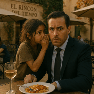 Mientras el viento otoñal agitaba las hojas secas, una figura pequeña apareció frente a su mesa. Era una niña, con ropa desgastada y mirada hambrienta. Se detuvo junto a él y susurró con una voz que heló la tarde: