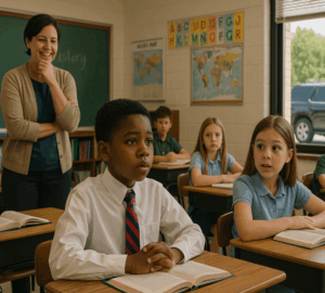 Al fondo del aula, Malik Carter, de apenas diez años, se removía incómodo en su asiento. Llevaba puesta la corbata obligatoria del uniforme, que parecía apretarle más de la cuenta. Cuando llegó su turno de hablar, respiró hondo y dijo con voz clara: