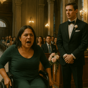 En plena ceremonia, cuando el sacerdote pidió silencio, las puertas de la iglesia se abrieron. Una mujer en silla de ruedas apareció y gritó: “¡Él es mi marido, me dejó después del accidente!”. El novio palideció, la novia tembló, y la verdad arruinó la boda soñada.