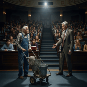 Era solo “el conserje”: un hombre con un balde, un trapeador torcido y dos décadas de anonimato. Los estudiantes lo esquivaban, algunos reían de él. Hasta que el decano detuvo la conferencia frente a cientos, caminó hacia él y reveló un secreto que convirtió la humillación en asombro y respeto.