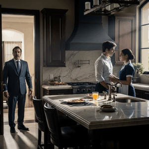 “Grant creía que nada podía sorprenderlo después de tantos años de lujo y poder. Pero al volver de un viaje, descubrió a su hijo y a la joven empleada en la cocina. Lo que ocurrió en ese instante rompió el silencio de la mansión y cambió su vida.”
