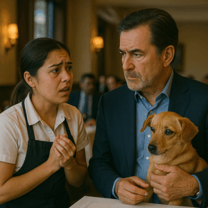 Una camarera se acercó al multimillonario más temido de la ciudad, con los ojos llenos de lágrimas y un cachorro en brazos: “Cómpralo, por favor… mi mamá se está muriendo y necesito dinero.” Él creyó que era una estafa, hasta que días después descubrió quién había tomado al perro, y lo que ocultaba el microchip en su cuello reveló una verdad que cambiaría su vida, exponiendo un pasado que creía enterrado bajo su propia fortuna.
