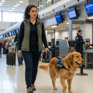 Era una mañana fría en Dallas cuando Emma se presentó en el aeropuerto acompañada de Max, su perro de servicio entrenado para ayudarla a manejar el trastorno de estrés postraumático (PTSD). Con su chaleco azul y su comportamiento tranquilo, Max pasó por los controles de seguridad sin problemas.