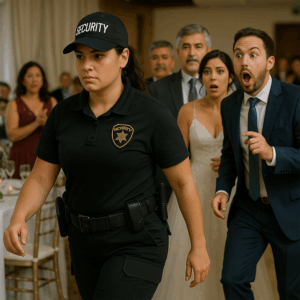 Cuando mi padre dijo frente a todos en la boda “Ella solo es una guardia de seguridad”, nadie imaginó que, unos segundos después, el silencio se rompería con un grito: “¡Dios mío, está en directo!”. Lo que ocurrió después cambió nuestras vidas para siempre.