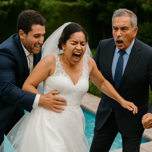 La novia, aún con su vestido blanco, cayó al agua frente a cámaras y familiares, empujada por su propio esposo. Las risas se congelaron de inmediato, y el silencio se apoderó de la fiesta. Entonces, el padre de la novia dio un paso al frente y su reacción sorprendió a todos
