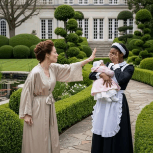 Grace, con una mano sobre su mejilla enrojecida, apenas pudo reaccionar. En sus brazos, la pequeña Amelia comenzó a llorar, alterada por el estallido repentino. Los sirvientes que se encontraban cerca se quedaron paralizados, temiendo intervenir.