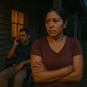 La noche estaba cargada de silencio, roto solo por los grillos en el jardín y el crujir de la madera vieja de la casa. Había terminado de fregar la cocina cuando escuchó el sonido de la silla de ruedas. Daniel, su esposo paralizado desde el accidente, salía al porche con el teléfono en la mano.