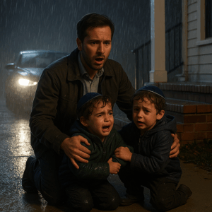 Al detener el coche frente a la casa que tanto orgullo le había dado comprar, David vio dos pequeñas figuras en el porche. Noah y Aaron, sus gemelos de cinco años, estaban acurrucados uno contra el otro, completamente empapados, con sus quipás pegados al cabello mojado y las lágrimas mezclándose con la lluvia.