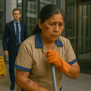 Mientras todos pasaban de largo, el director general notó los moretones en la señora que trapeaba los pisos de cristal del rascacielos. Lo que sucedió después no solo cambió la vida de la mujer, sino que también impactó a toda la compañía con un gesto tan sorprendente como conmovedor.