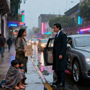 Primero fue un movimiento bajo, casi invisible, cerca de la esquina: una mujer con el cabello pegado a la cara por la lluvia, abrazando a dos niños pequeños bajo una manta vieja. Los niños temblaban. La mujer no alzaba la voz. No golpeaba ventanas. No pedía con teatralidad.
