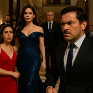 Las risas y el tintinear de copas se apagaron en un segundo cuando Sofía Mendoza apareció en lo alto de la escalera del gran salón de baile. Su vestido azul marino, adornado con destellos que parecían estrellas, la hacía brillar como reina entre un mar de invitados.