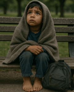 Era una madrugada helada cuando los primeros transeúntes lo vieron. Apenas tenía cinco años. Estaba sentado en un banco de madera del parque central, con los pies descalzos, una manta vieja sobre los hombros y una mochila rota a sus pies. No lloraba, no pedía nada, no hablaba con nadie. Solo miraba fijamente al cielo como si esperara una señal.