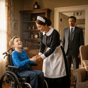 There was Ethan, cheeks flushed, his thin arms outstretched. Clara, the young maid he barely noticed during his busy days, held his hands. She spun his wheelchair in playful circles, moving her own feet as if he were leading a ballroom dance.