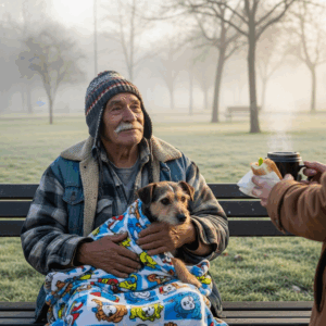 En medio del bullicio de la ciudad, había una escena que se repetía cada mañana: un anciano sentado en una banca, con un perro envuelto en una manta de caricaturas. No tenían nada, salvo la compañía del otro. Pero ese pequeño gesto de amor y lealtad bastaba para conmover a cualquiera que los observara.