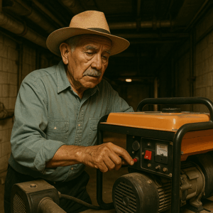 El anciano dejó a un lado su sombrero, se arrodilló frente al generador y comenzó a palpar los cables, como si conociera cada fibra de la máquina. Golpeó suavemente una válvula, giró una llave de paso y murmuró algo para sí mismo.