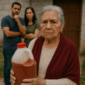 Exactamente 48 horas después, los traidores escucharon golpes en la puerta. Era Doña Elvira. Vestía la misma ropa con la que se había marchado, pero en sus manos llevaba un bidón de salsa casera que ella misma preparaba desde hacía años y vendía en el mercado.