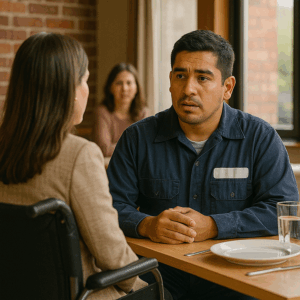 “Un mecánico humilde fue a una cita a ciegas y se sentó en la mesa equivocada… pero aquella confusión lo llevó a conocer a la hija del director general de una gran empresa, una joven en silla de ruedas que cambiaría su destino y el de toda su familia para siempre.”