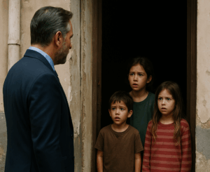 Tres niños pequeños, de ojos grandes y asustados, lo miraban como si frente a ellos estuviera la muerte en persona. Llevaban ropa desgastada, calcetines rotos y un miedo que hablaba más fuerte que cualquier palabra.