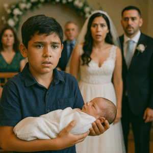 Un niño de 9 años interrumpió una lujosa boda con un recién nacido en brazos: nadie entendía qué hacía allí, pero cuando reveló la verdad frente a todos, el silencio que siguió cambió para siempre la vida de los novios.
