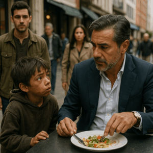 Un niño sin hogar se acercó a un millonario en un restaurante y le preguntó con timidez: “¿Puedo comer tus sobras?” Pero lo que el hombre hizo después dejó sin palabras a todos los presentes y cambió dos vidas para siempre.