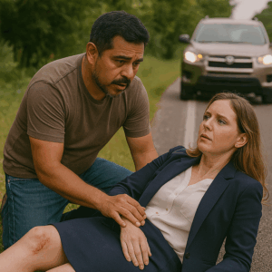 Un padre soltero detuvo su coche bajo la lluvia para ayudar a una mujer herida al costado del camino. No sabía su nombre, ni su historia… hasta que, días después, entró a su nuevo trabajo y descubrió que ella era su jefa.