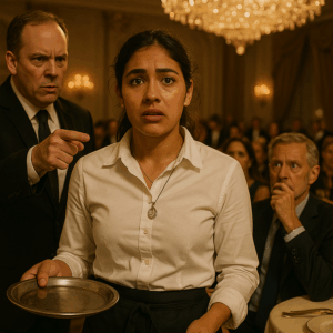 Pero el destino parecía decidido a jugar en su contra. Un tropezón, un vaso de vino derramado sobre el vestido de una mujer adinerada, y el escándalo estalló como un trueno. La música se detuvo por un instante; las risas se congelaron. El gerente del hotel, con voz altisonante, la señaló ante todos: