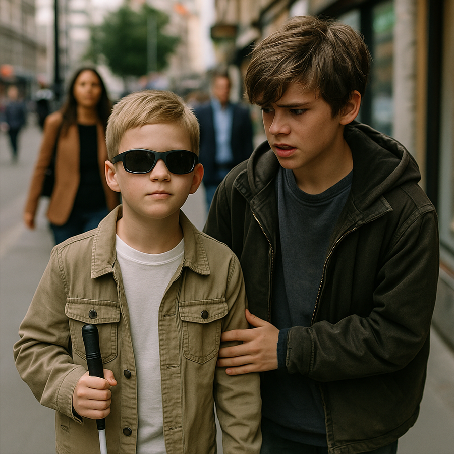 Entre la multitud, Ethan Blackwell, de apenas 10 años, caminaba solo. Llevaba gafas oscuras y un bastón blanco. Era ciego desde su nacimiento, pero su seguridad al moverse demostraba que estaba acostumbrado a enfrentar la vida sin miedo.