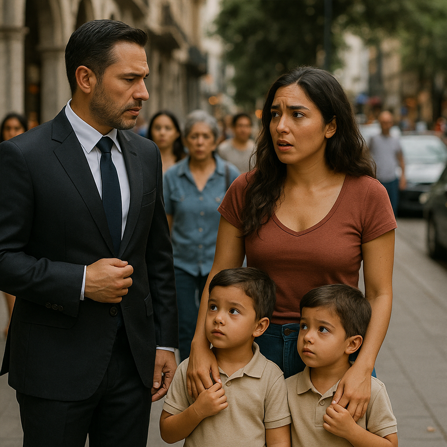 Lucía, visiblemente sorprendida, apretó la mano de sus hijos y trató de apartarse, pero Eduardo dio un paso al frente.