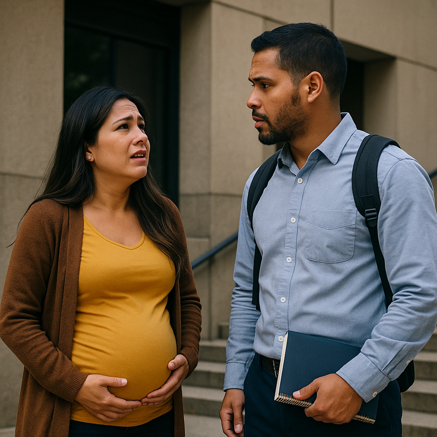 Pero a pocas cuadras de la parada, algo llamó su atención: una mujer embarazada, parada junto a un taxi detenido, discutía con el chofer mientras trataba de levantar un bolso del suelo. La mujer, visiblemente pálida y con una mano en el vientre, parecía tener dificultades para respirar.