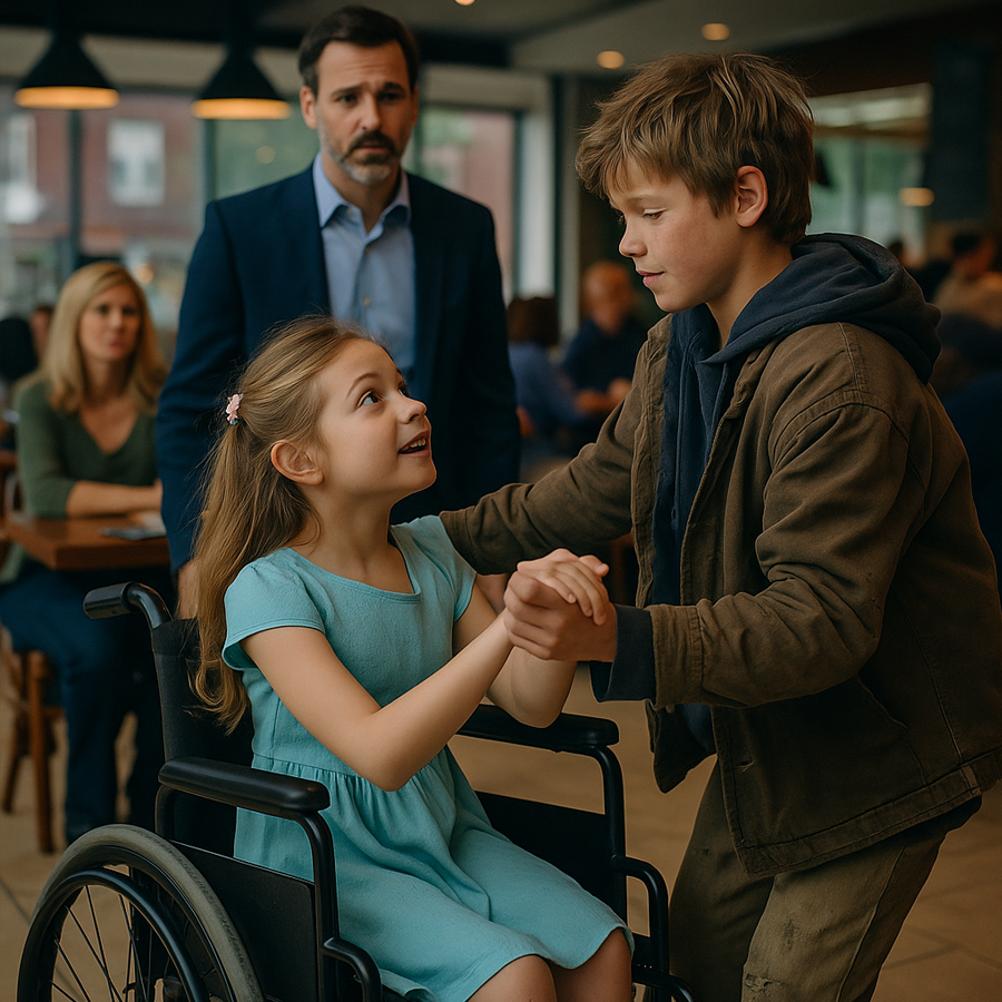 Mientras el padre intentaba distraerla con un helado, un niño con la ropa sucia y el cabello despeinado se acercó.