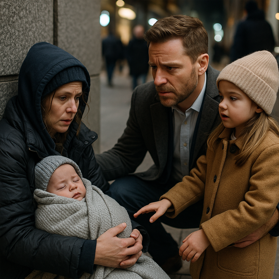 Pero, bajo el resplandor de las decoraciones, una joven madre se acurrucaba contra una pared fría, tratando de abrigar a su bebé con una manta raída.