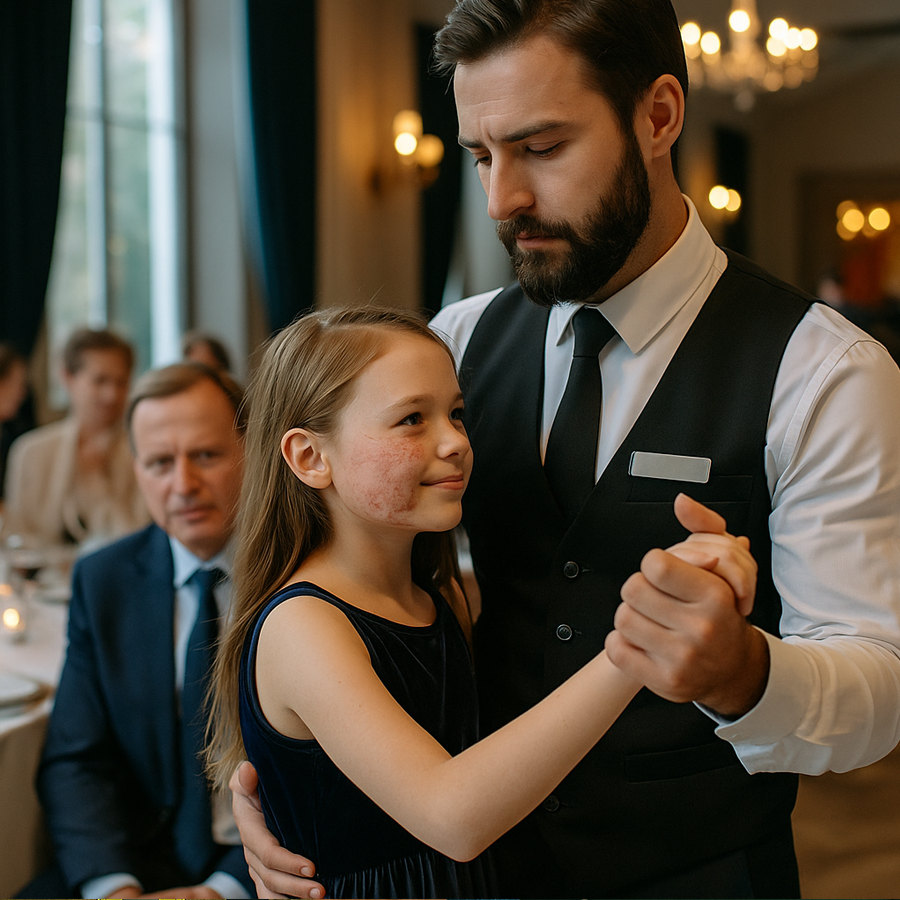 Un mesero soltero, un hombre sencillo y desconocido, tomó la mano de la hija del CEO más poderoso de la sala, una niña con una cicatriz en el rostro que evitaba mirar a los demás.