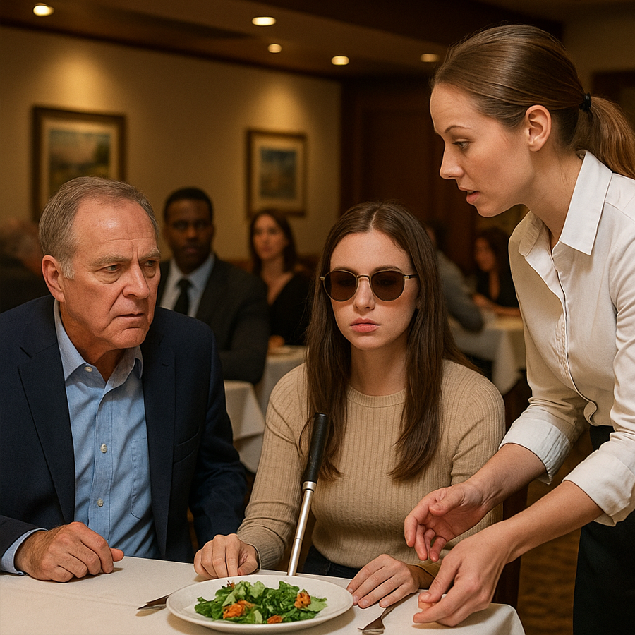 La joven, con sus gafas oscuras y un bastón blanco apoyado a su lado, movía con delicadeza la cabeza hacia los sonidos del restaurante. Robert, siempre protector, le hablaba en tono cálido y paciente, aunque detrás de su voz se escondía una tristeza que llevaba años arrastrando.