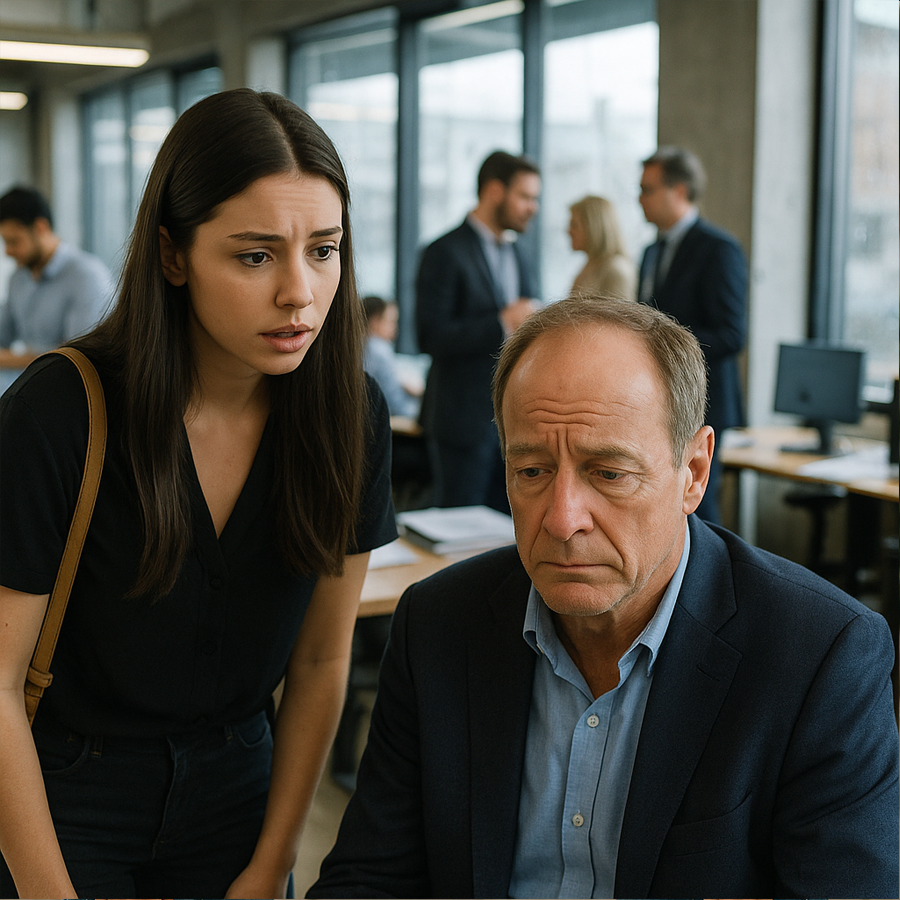 Pero Emily no se fue. Se sentó frente a él, encendió su computadora y comenzó a trabajar en silencio. En los días siguientes, el hombre notó algo en ella que le resultaba extraño: no lo trataba con lástima ni con desprecio, sino con respeto.