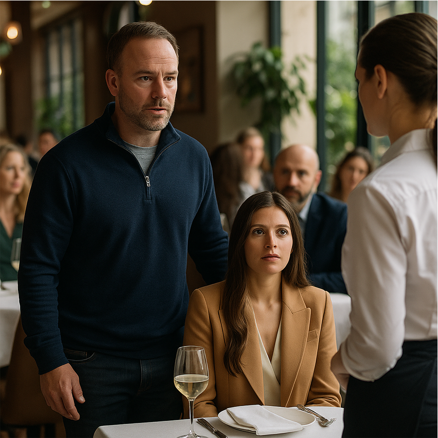 El camarero apenas tuvo tiempo de reaccionar cuando un hombre de aspecto sencillo, con mirada firme y voz serena, pronunció tres palabras que hicieron temblar a una de las familias más poderosas del país: