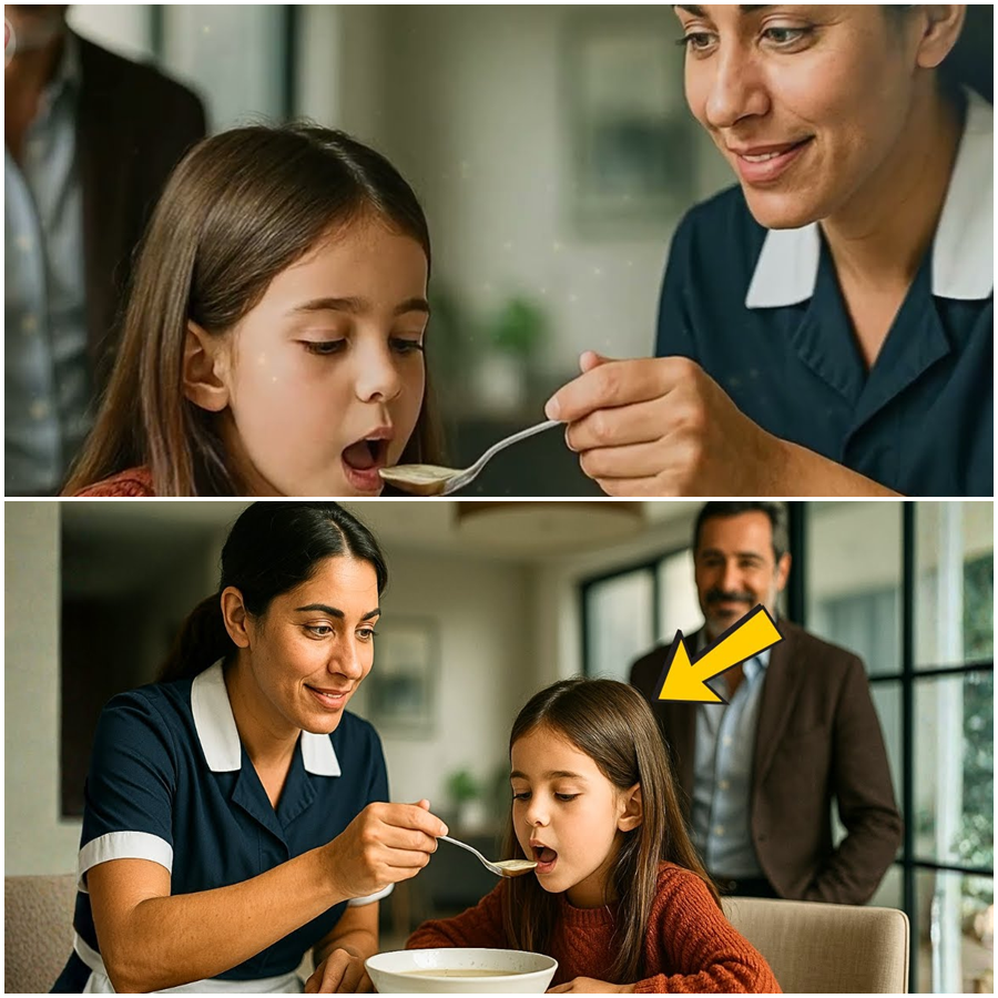 🚨Durante dos semanas, la hija del empresario viudo rechazó cada comida, cada intento de consuelo y cada gesto de afecto… hasta que llegó la nueva empleada del hogar y ocurrió algo tan inesperado que la mansión entera quedó en silencio. Lo que pasó después reveló un vínculo oculto, un secreto familiar y una verdad que transformó la vida de todos.🔥