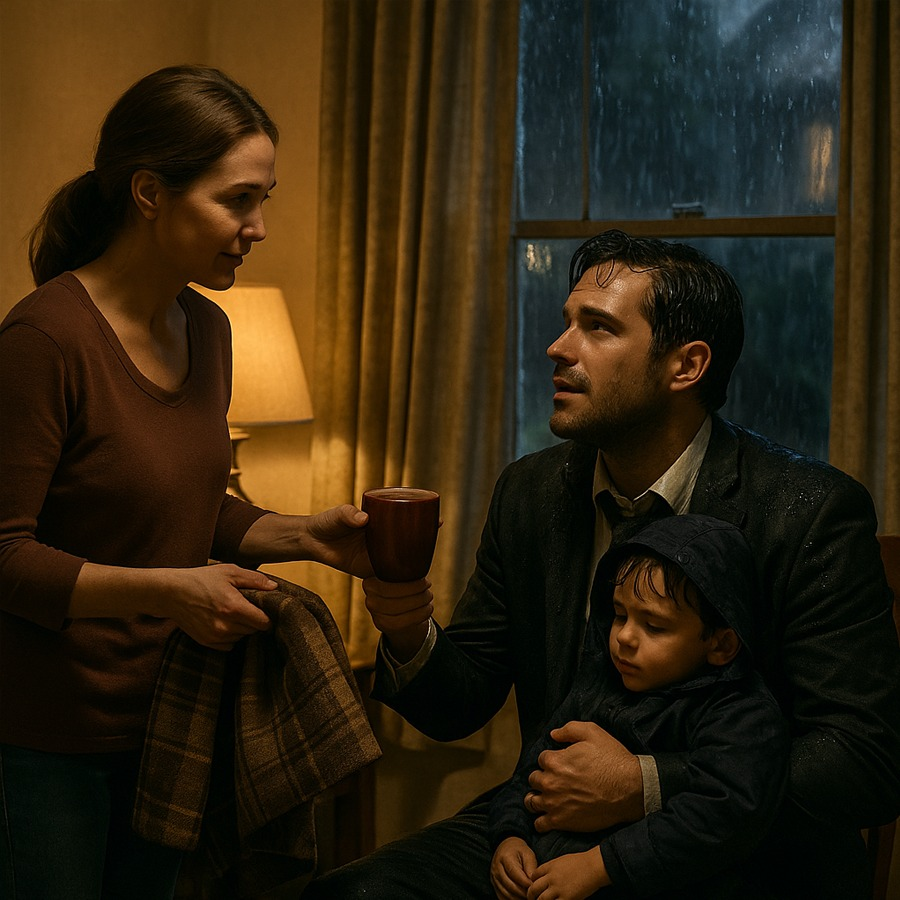 Al mirar por la ventana, vio a un hombre empapado, con un niño dormido en brazos. Ambos temblaban bajo la lluvia.