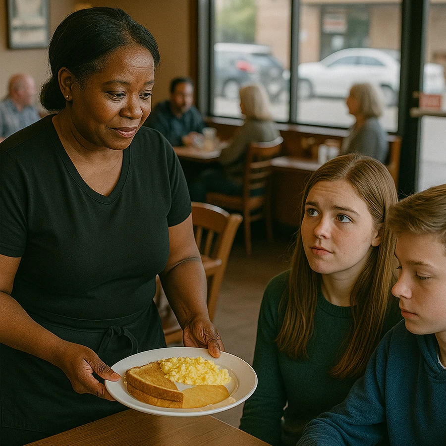 Se sentaron en una esquina sin pedir nada, solo observando cómo los demás comían. La camarera, cuyo nombre era Angela, notó enseguida la situación. Podría haberlos echado, pero en lugar de eso, tomó un plato con huevos revueltos, tostadas y un vaso de leche, y se los llevó con una sonrisa.