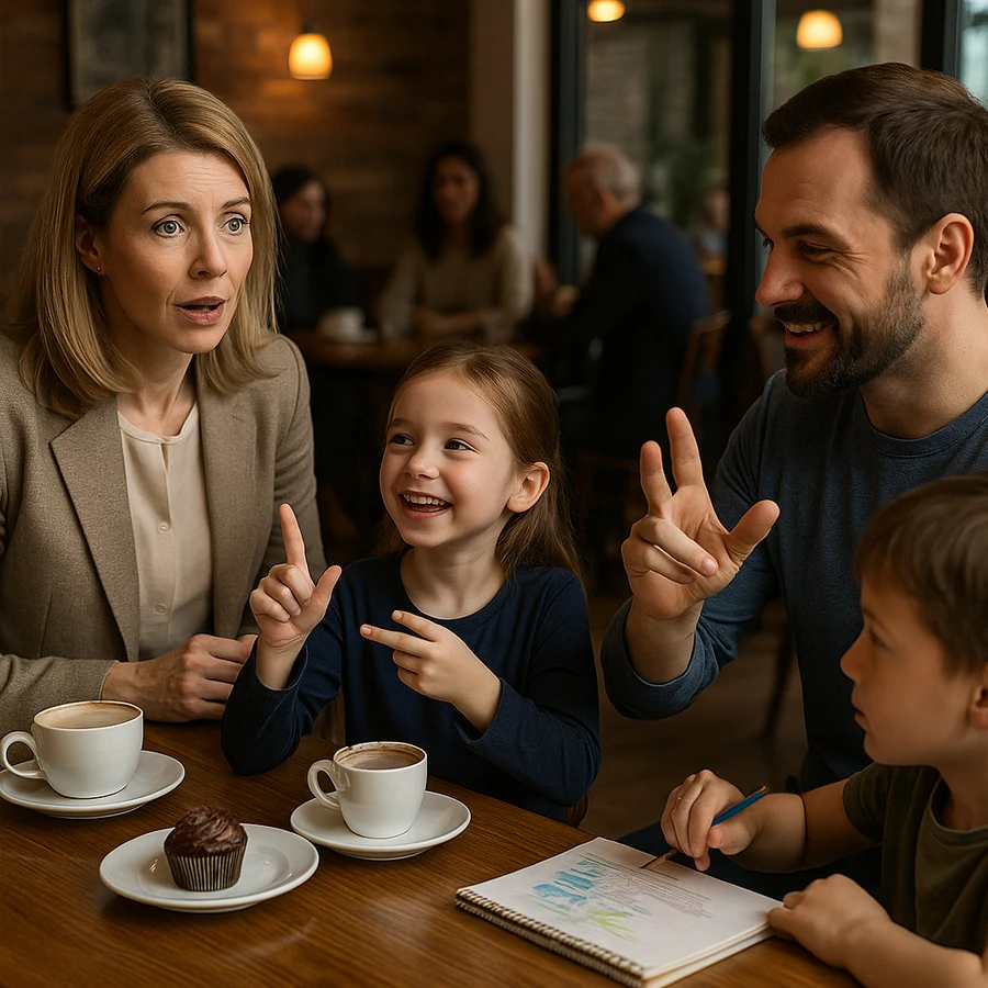 La tarde avanzó y el café se llenó de una energía distinta. Valeria, antes tímida y aislada, ahora estaba rodeada: Mateo le mostraba sus dibujos, Gabriel la ayudaba a expresarse, y hasta algunos clientes imitaban sus gestos, intentando aprender.