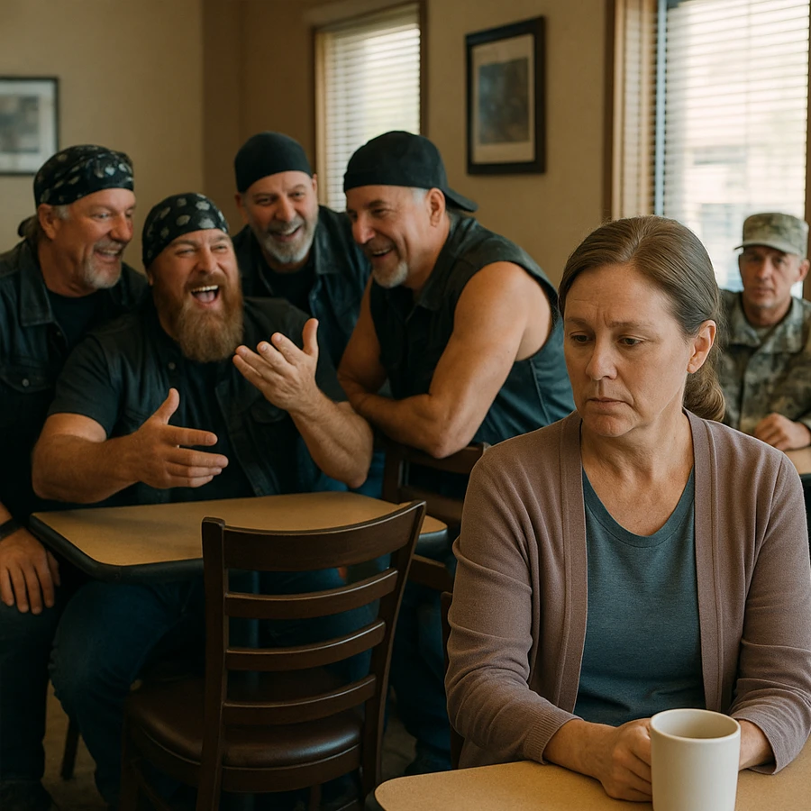Era una tarde tranquila. Ana Rodríguez, una mujer de mediana edad, estaba sentada sola en una mesa del café, tomando lentamente su taza mientras leía un cuaderno. De pronto, un grupo de cinco motociclistas entró con ruido, risas y pasos pesados.